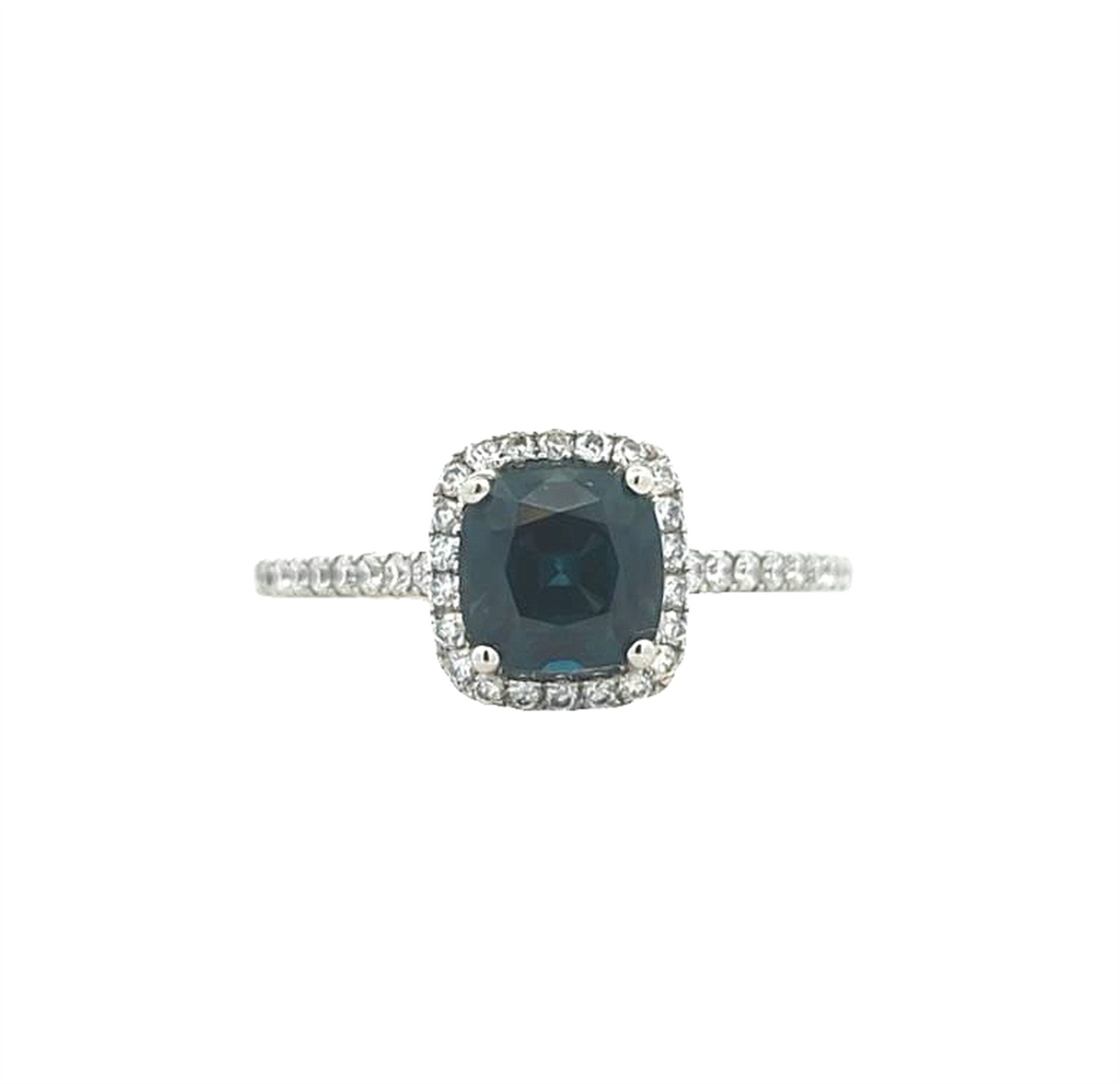 One claw set rectangular cushion mixed cut natural blue sapphire, measuring 6.05 x 5.95 x 3.87mm (depth est.) approximate weight of 1.25ct., clarity is eye clean, type II, dark, moderately strong, blue colour, (GIA B 7/4), cut is good.