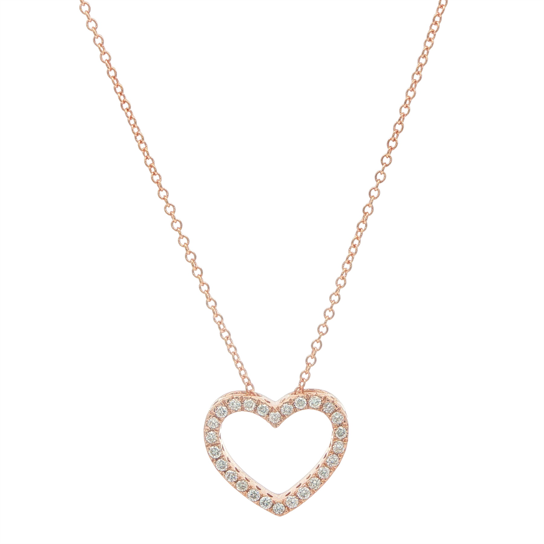 One set stamped 14KT rose gold hand assembled custom made diamond heart shaped pendant and chain. The chain is 18.0" long, light rolo link with a lobster claw clasp and a high polish finish.