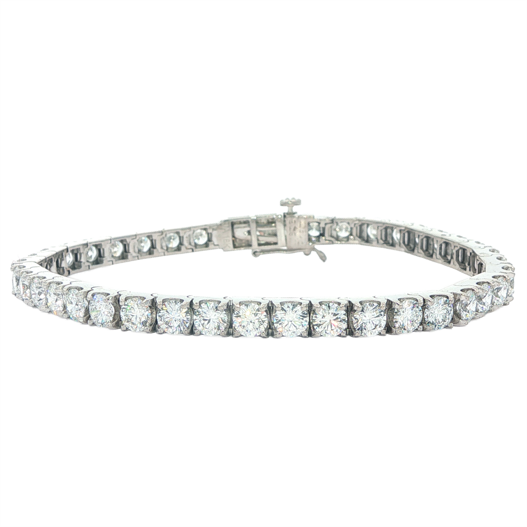 One stamped 18KT white gold hand assembled custom made diamond 7" long tennis bracelet with a custom box clasp and a high polish finish.