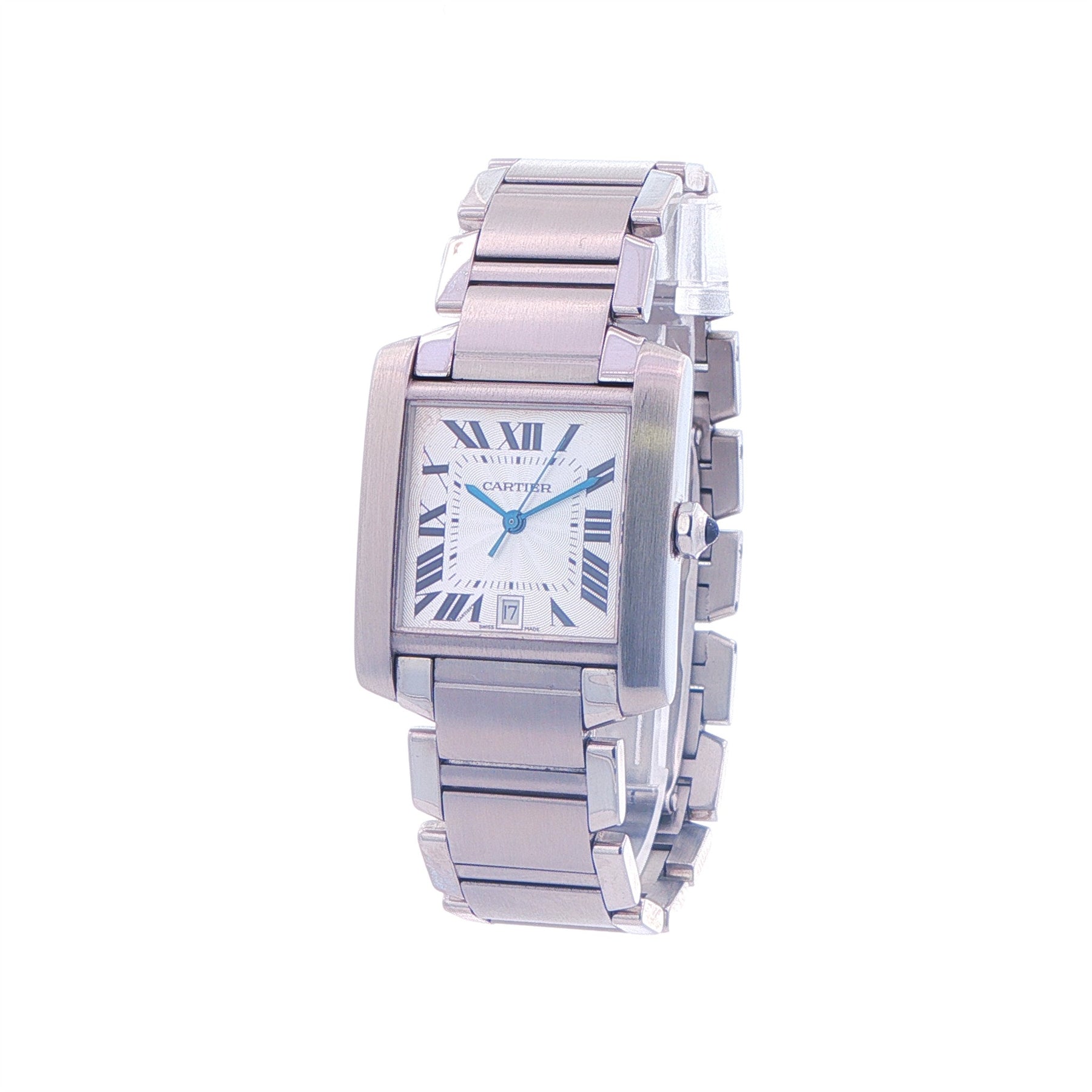 A timeless icon of Parisian elegance, this Cartier Tank Française blends refined luxury with everyday versatility. Its crisp stainless steel case and integrated bracelet flow seamlessly into Cartier’s signature rectangular silhouette, crowned with the classic blue sapphire cabochon. The silvered dial with bold Roman numerals and blued steel hands delivers unmistakable Cartier character. Sophisticated, enduring, and instantly recognizable — this is a watch that elevates every wrist with quiet confidence and enduring style.