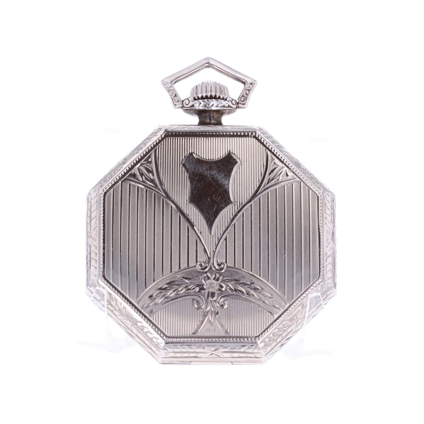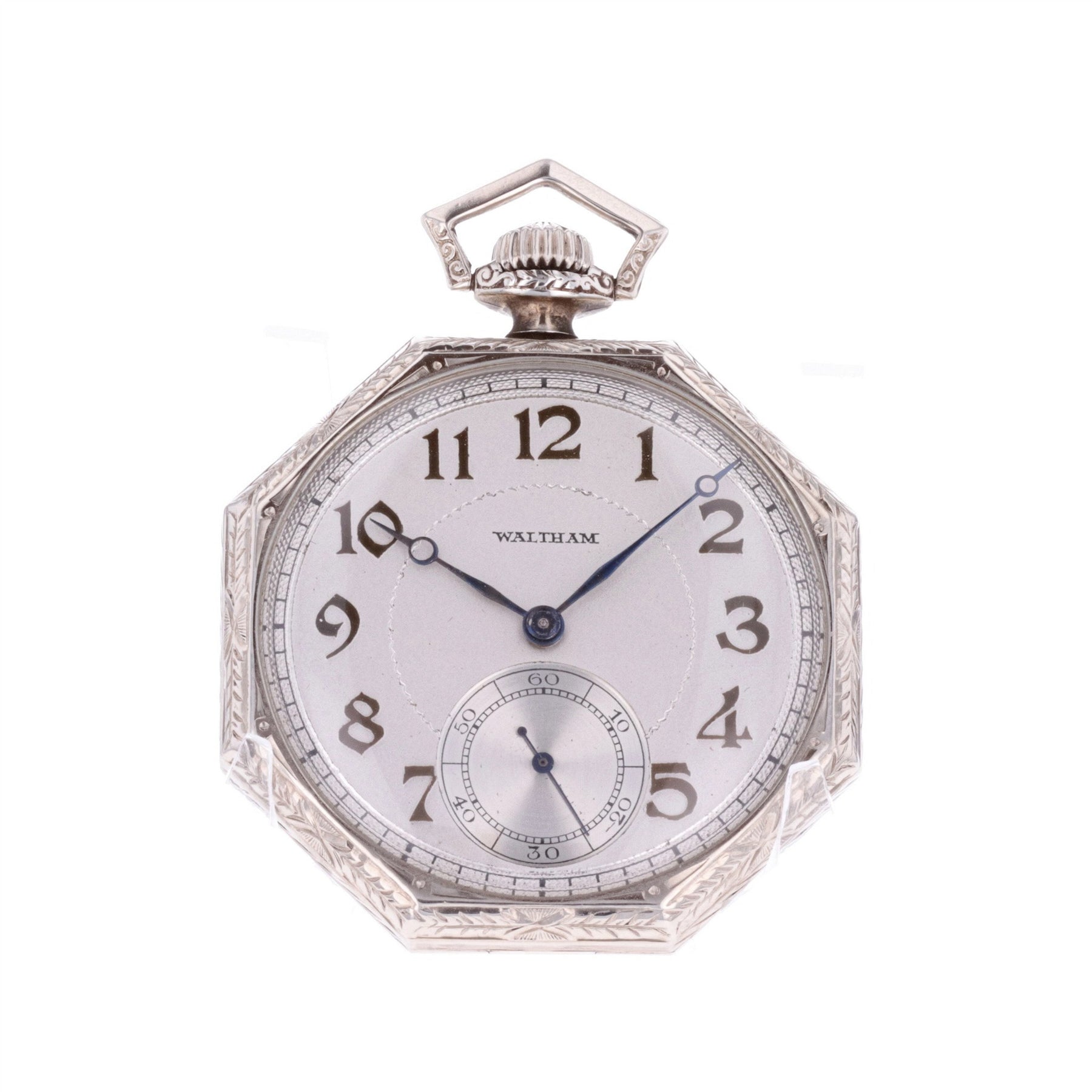 Here we have a very unique model 1894 from 1920. This is a size 12s (43 mm), The 17 jewel , 3/4 bridge nickel finish movement has a Breguet hairspring,micrometer regulator housed in a wonderful 14 k engraved, octagon case. During in-house testing the watch was fully functional. Overhaul is recommended at the buyer’s expense. Long-term precision and regularity cannot be guaranteed.