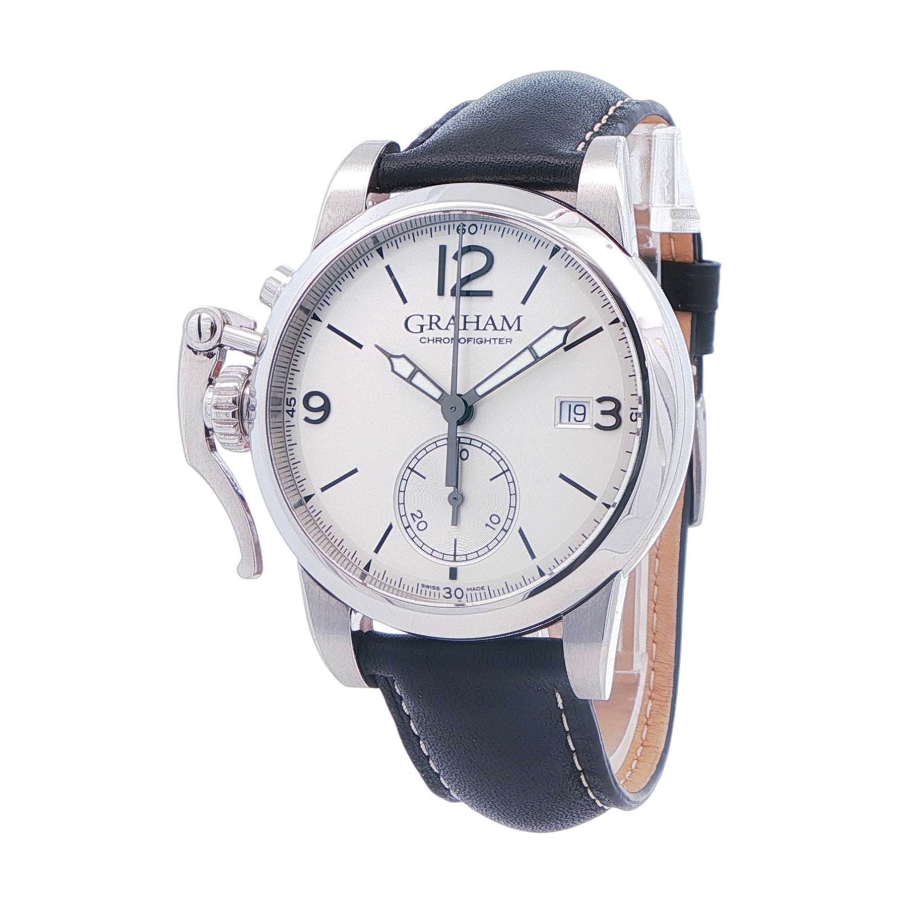 This Graham Chronofighter is a timepiece that refuses to blend in. With its distinctive left-hand trigger chronograph mechanism, it offers a nod to historical military timing instruments while delivering modern-day precision and presence. Housed in a robust 42mm stainless steel case with a sleek silver dial, this watch combines heritage and innovation in one unmistakably bold design. The oversized chronograph lever isn't just for show—it's engineered for ease of use, even with gloves, making it ideal for both adventurers and style-forward collectors. Powered by an automatic movement, it offers reliable performance and a smooth, confident sweep of the hands. Whether you're expanding a collection or looking for a watch that stands out from the crowd, the Chronofighter 1695 delivers timeless craftsmanship with a rebellious edge. This is not just a watch—it’s a statement.