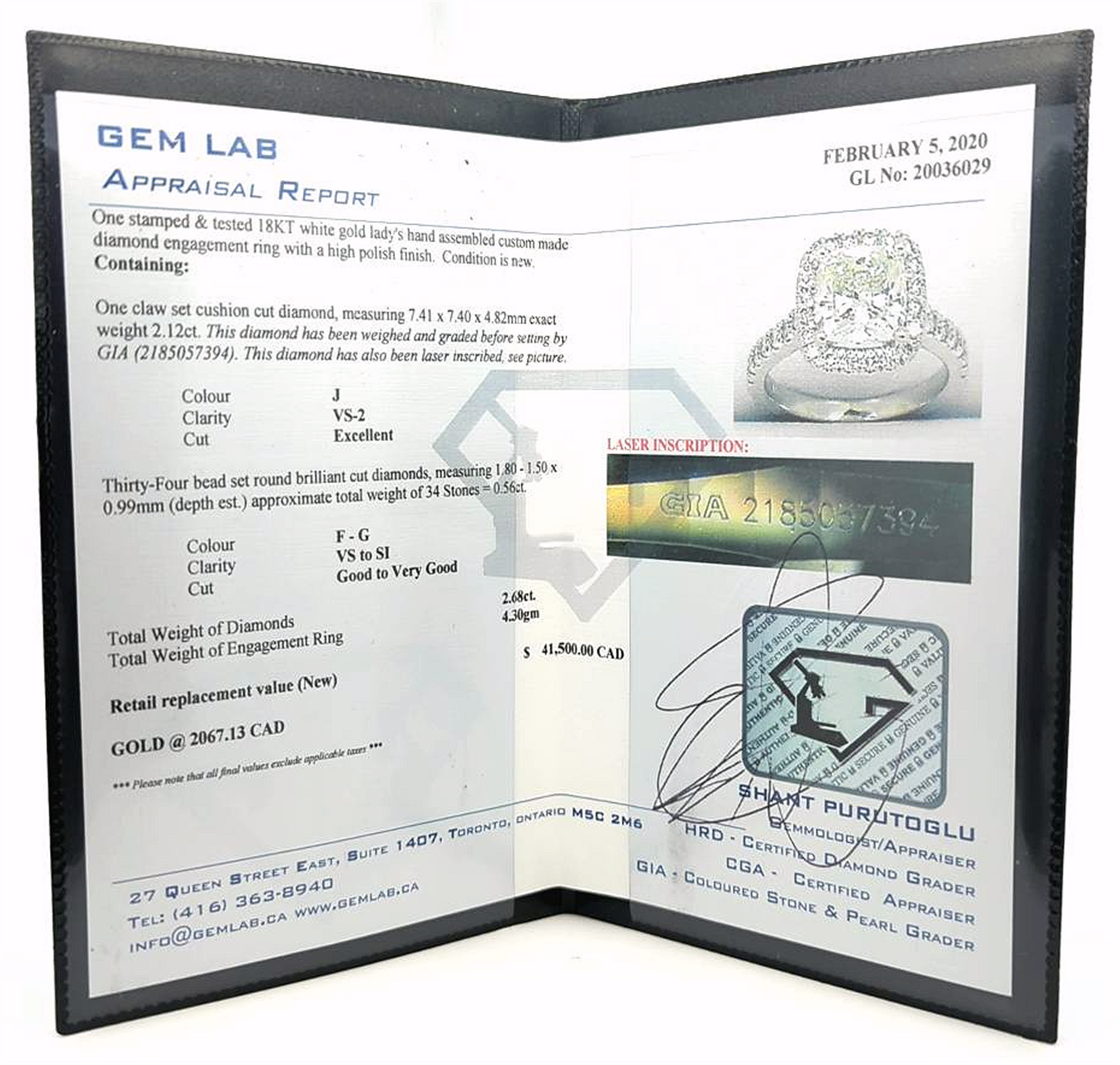 One claw set cushion cut diamond, measuring 7.41 x 7.40 x 4.82mm exact weight 2.12ct. This diamond has been weighed and graded before setting by GIA (2185057394). This diamond has also been laser inscribed, see picture.