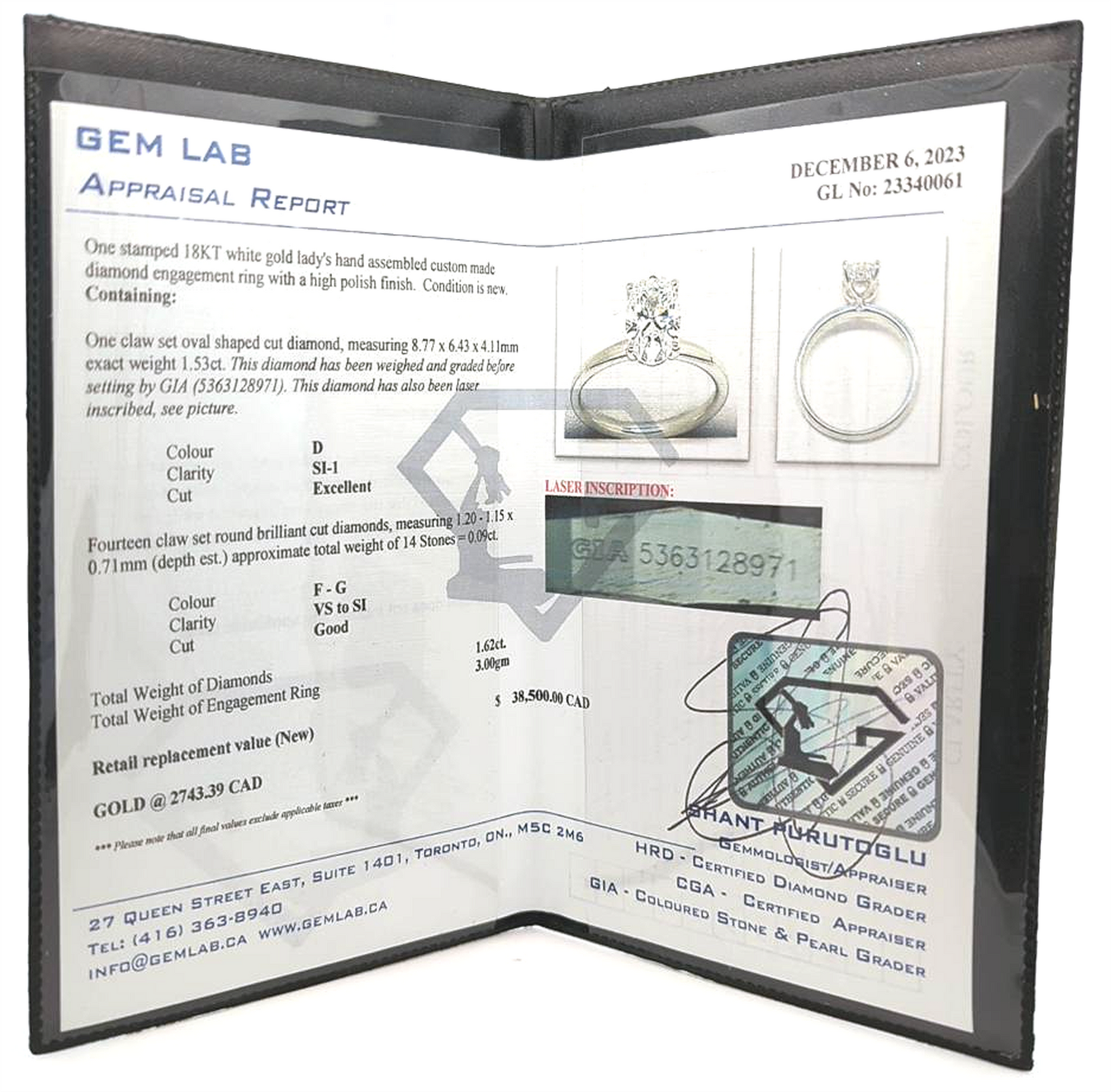 One claw set oval shaped cut diamond, measuring 8.77 x 6.43 x 4.11mm exact weight 1.53ct. This diamond has been weighed and graded before setting by GIA (5363128971). This diamond has also been laser inscribed.