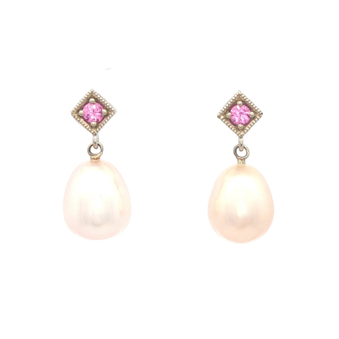14K White Gold Pink Sapphire Pearl Drop Earrings