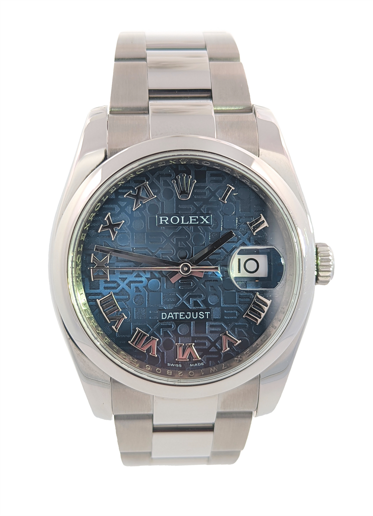 This Rolex Datejust 116200 with its striking blue Jubilee dial is a captivating take on Rolex’s classic design. The rich blue hue, paired with the intricate Jubilee pattern, creates a mesmerizing depth that plays with light, offering a refined and unique aesthetic. Framed by a smooth stainless steel bezel, the 36mm case houses the dial’s Roman hour markers and the iconic date window at 3 o’clock, complete with Rolex’s signature Cyclops lens. This model perfectly balances elegance and everyday wearability, making it a timeless choice for those who value both style and individuality.