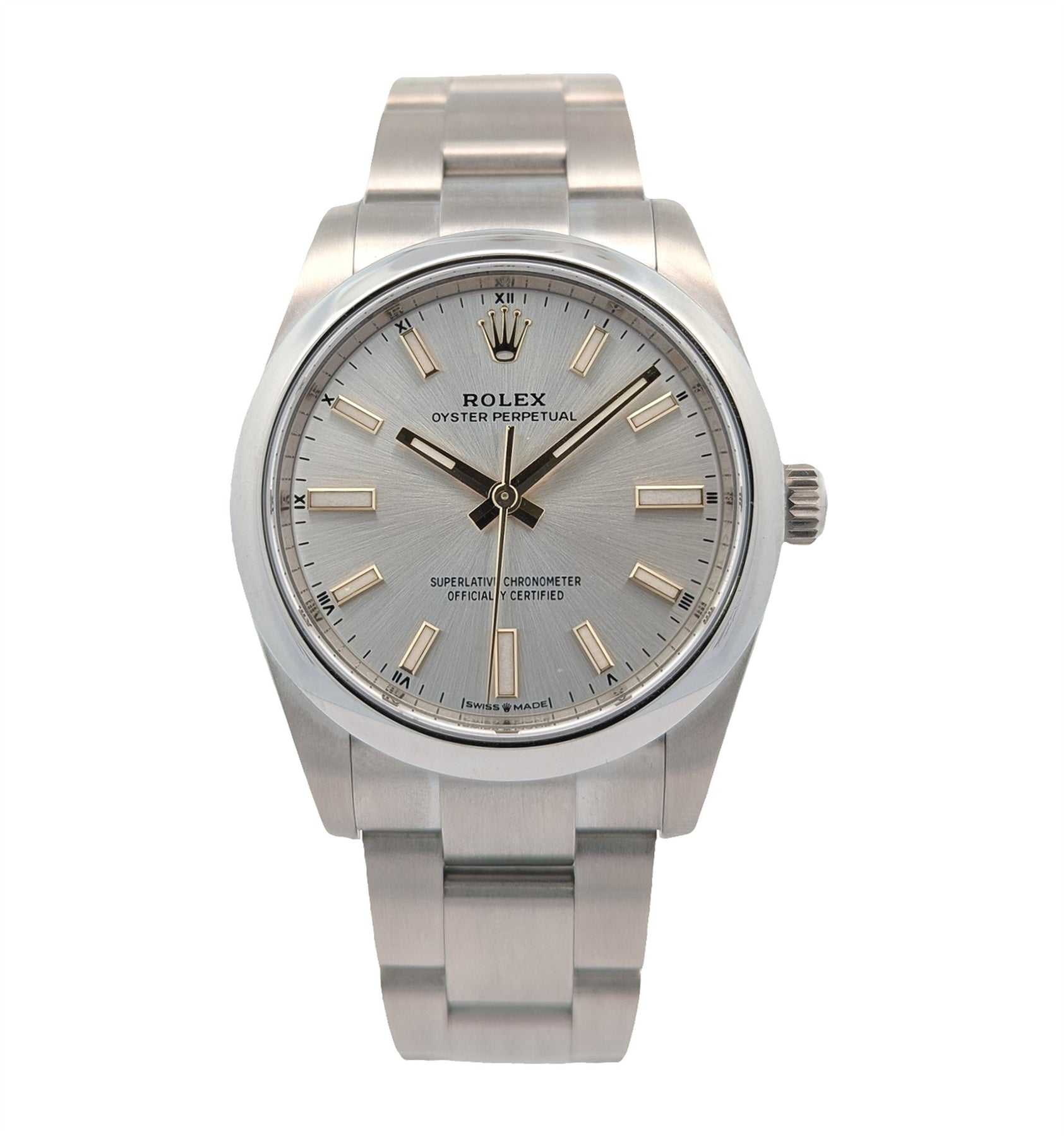 This Rolex Oyster Perpetual with a silver dial displaying subtle gold accents, is the kind of watch that doesn’t try to impress—because it already knows it’s better than your smartwatch. With its clean, minimalist face and perfectly proportioned 34mm case, it’s the horological equivalent of someone who shows up early, remembers your dog’s name, and still manages to look cooler than everyone else in the room. It doesn’t scream luxury; it casually mentions it in passing while adjusting its precision-machined bracelet. Understated? Yes. Forgettable? Not a chance.