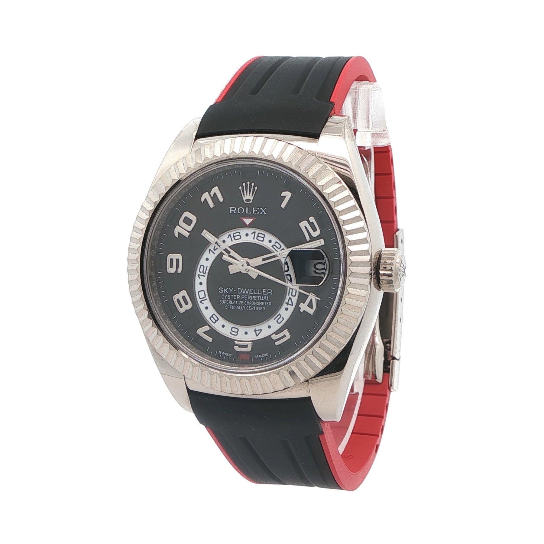 This Rolex Sky-Dweller with a black dial and black/red Rubber B strap is part world-timer, part boardroom boss. It juggles dual time zones and an annual calendar with ease, all while looking like it could run laps around your dress watches. Sleek in black with just enough red attitude, it’s the kind of Rolex that says, “Yes, I know what time it is in Geneva—I just don't care.”