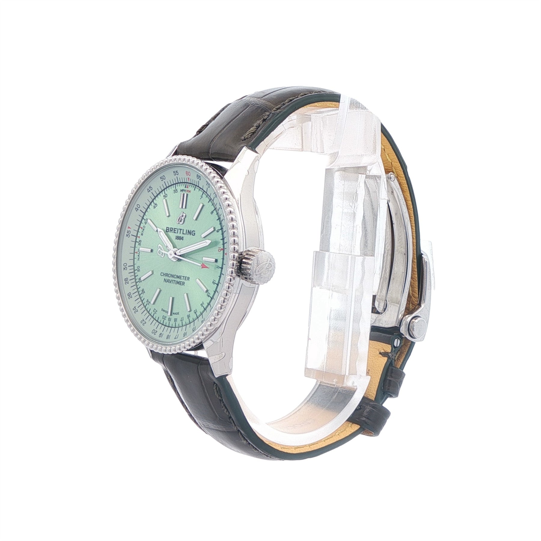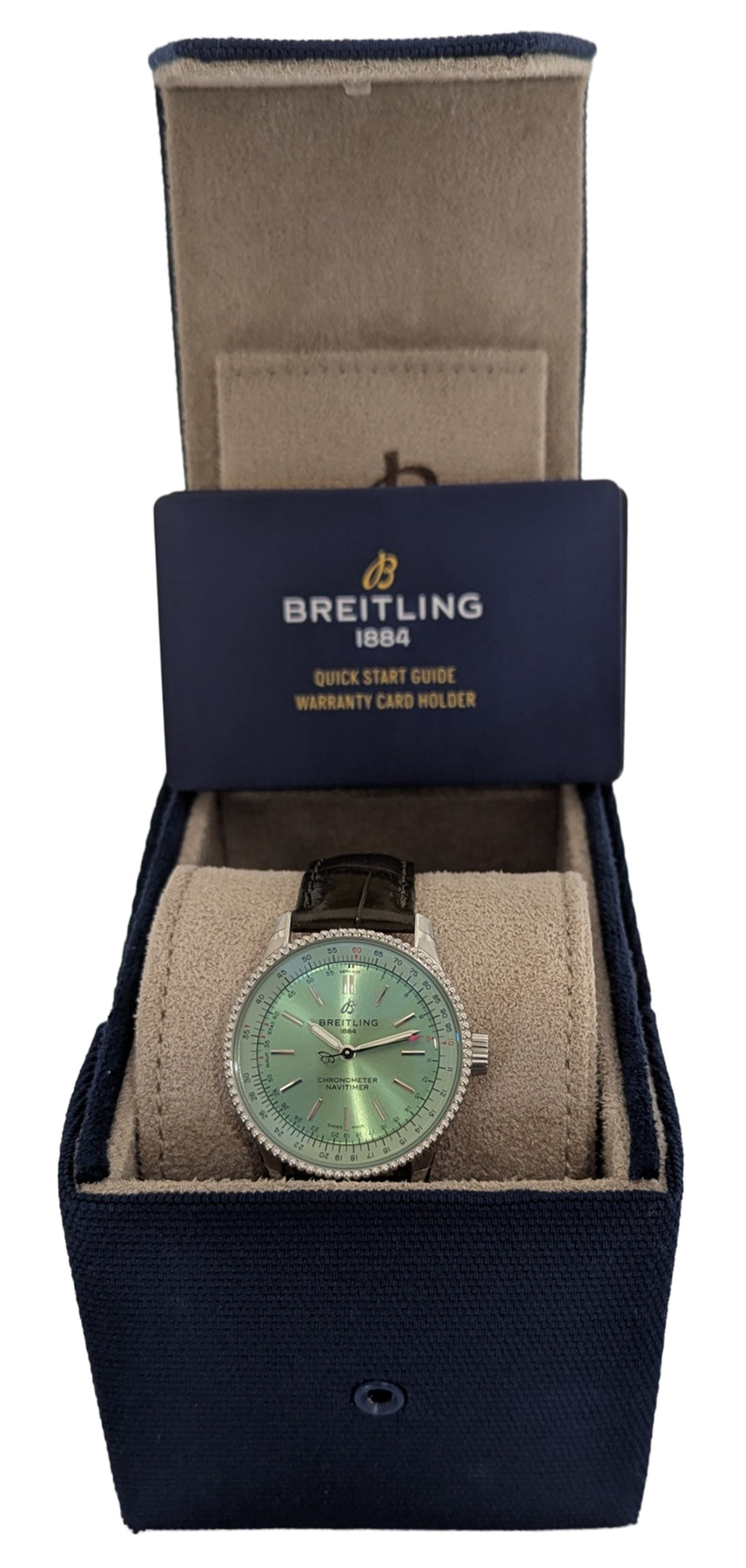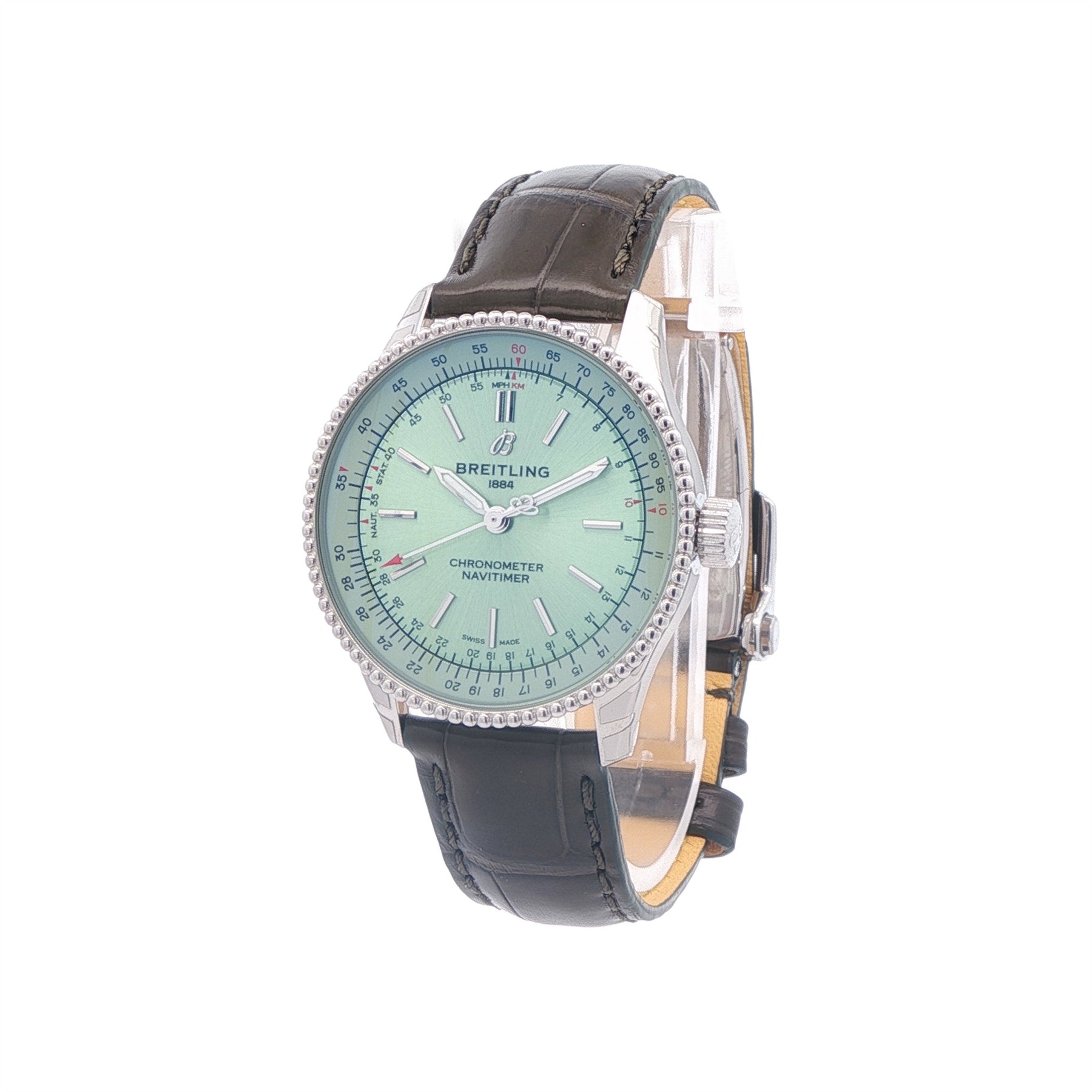 Timeless elegance meets aviation heritage in this striking Breitling Navitimer Automatic 35. With a refined 35 mm stainless steel case and a crisp, legible dial framed by the iconic circular slide rule, this watch balances classic pilot-watch DNA with everyday versatility. Powered by a reliable automatic movement, it delivers smooth performance and enduring precision in a compact, stylish package. The cleanmint green dial, polished case, and comfortable strap make it perfect for both formal occasions and everyday wear. A superb choice for collectors and enthusiasts seeking a sophisticated Navitimer with timeless appeal.