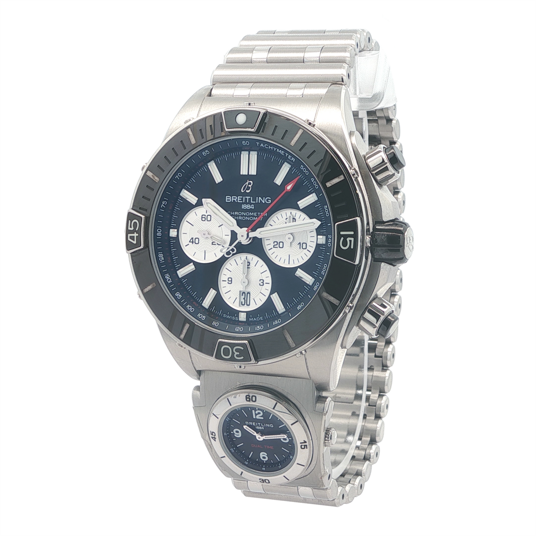 This Breitling Super Chronomat B01 features a sleek black dial paired with a durable ceramic bezel insert and a practical UTC complication, offering dual-time convenience. Bold, precise, and unmistakably Breitling, it blends sporty sophistication with everyday versatility.