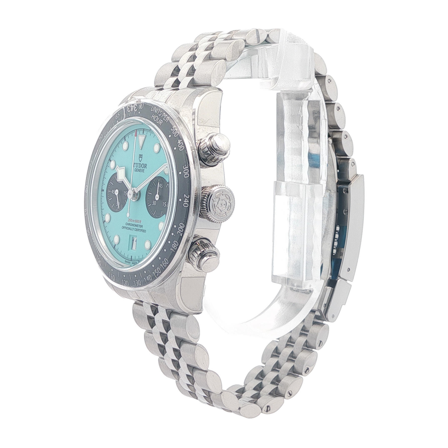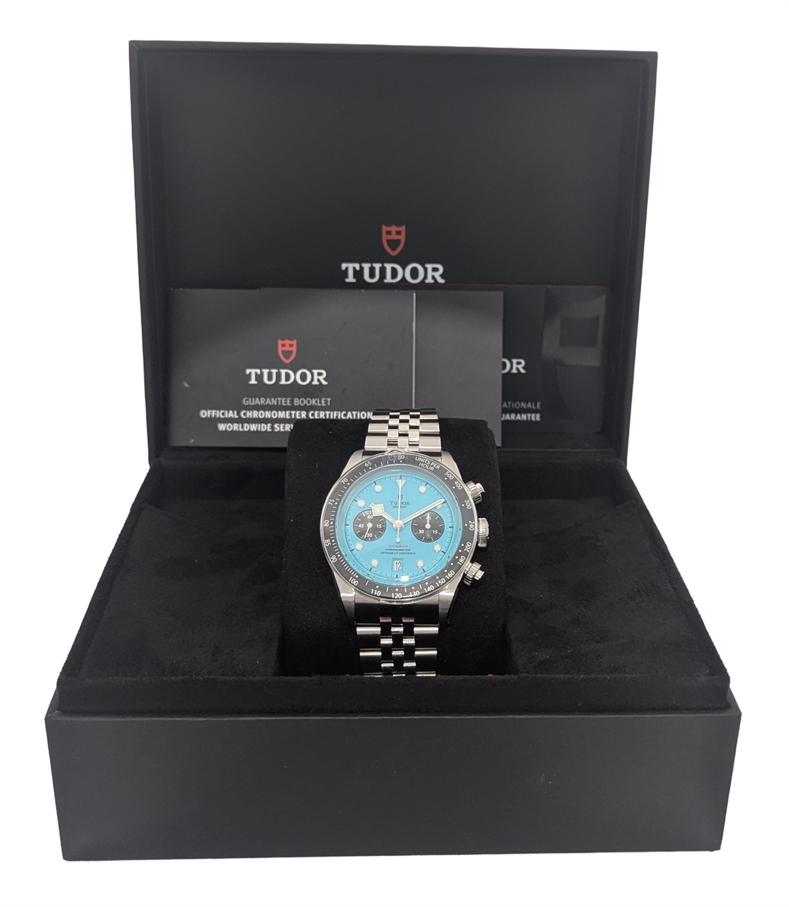 A bold evolution of Tudor’s iconic chronograph, this Tudor Black Bay Chrono “Flamingo Blue” delivers standout presence and serious Swiss performance in one highly sought-after package. Its vibrant Flamingo Blue dial with contrasting black sub-counters and signature Snowflake hands pops inside a 41mm stainless steel case, while the fixed tachymeter bezel and screw-down pushers reinforce its motorsport DNA. Powered by Tudor’s COSC-certified manufacture Calibre MT5813 with column wheel, vertical clutch and an impressive 70-hour power reserve, it offers precision and reliability to match its looks. With 200m water resistance and a comfortable five-link bracelet featuring Tudor’s T-Fit quick-adjust clasp, it’s equally ready for daily wear or weekend adventures. Extremely hot on the market and increasingly hard to find, this model is a standout opportunity for collectors and enthusiasts who want something distinctive, modern, and genuinely in demand.