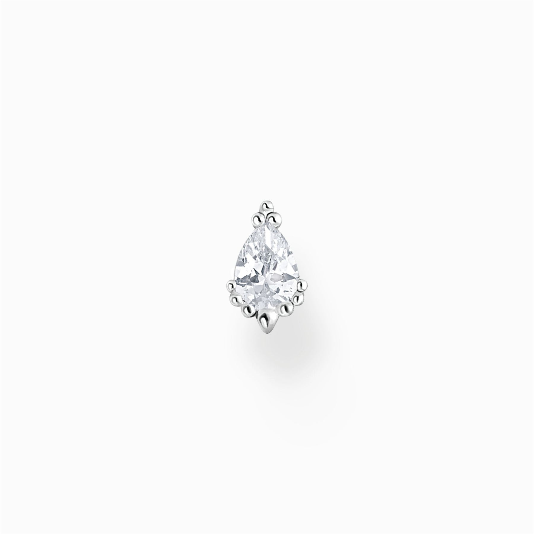 Winter’s glamour: The small single stud earring is made of high-quality 925 Sterling silver. A drop-cut, white zirconia stone is the highlight of this filigree design. Several elevated dots adorn the ear stud on the upper and lower end.