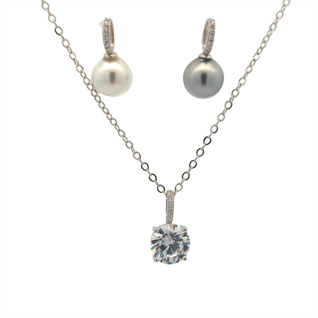 Sterling Silver Cubic Zirconia 16+2" Necklace And Pearl Pendants Set