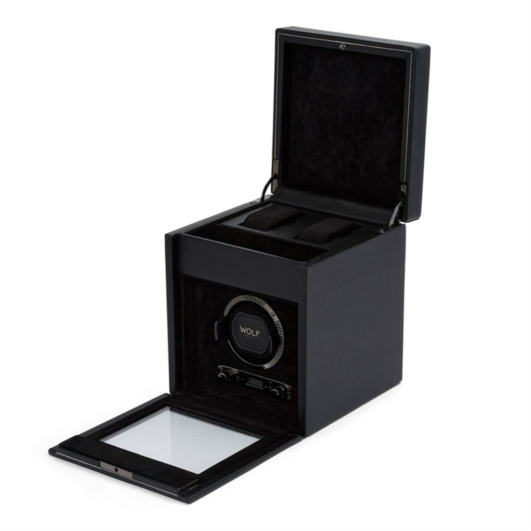 Handmade throughout, British Racing melds the green international motor racing colour of the UK’s cars raced in Ireland in the early 1900’s with a revolutionary quad angled panelled lid. Fine work detailing includes hand-pressed gold foil lines on vegan friendly pebble-grained leather. Gold hardware accents throughout with cushion close hinges and fluted bezel. Another design first from WOLF. Take your watches for a spin in the single watch winder with storage.