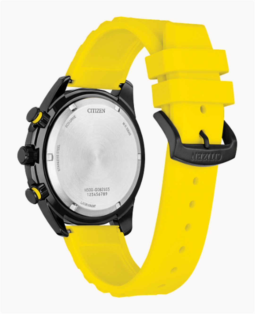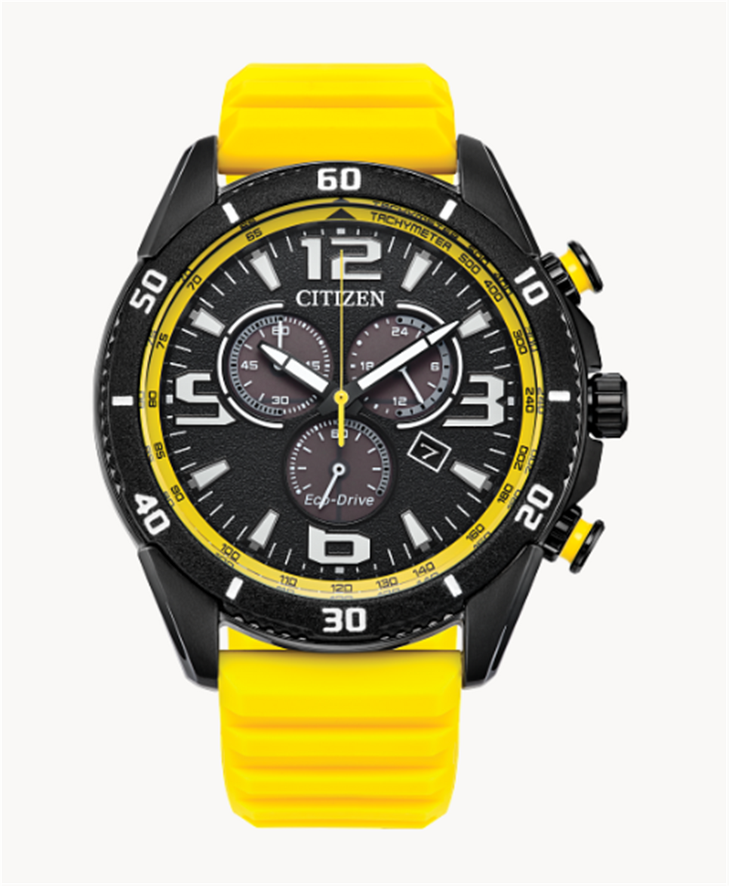 On the dial, the sporty styling continues, with lume-filled, highly legible hour markers anchoring the look, while a yellow tachymetric scale outlines the display. Advanced functions include a 1-second chronograph measuring up to 60 minutes, 12/24 hour time, and a date indicator at the 4 o'clock position. The men’s high-performance Brycen is sustainably powered by any light with Citizen's proprietary Eco-Drive technology that never needs a battery. Water resistant up to 100 metres. Calibre H500.