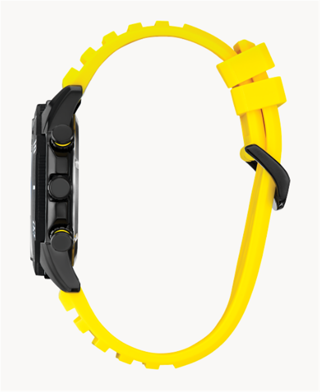Bold and sporty, this new Brycen chronograph is ready for any adventure. The watch wears boldly at 44.8mm, with a black-tone stainless steel case accented with yellow details on its racing-style pushers. A rotating 60-minute bezel adds to its functionality, while a durable yellow silicone strap secures the timepiece to the wrist.
