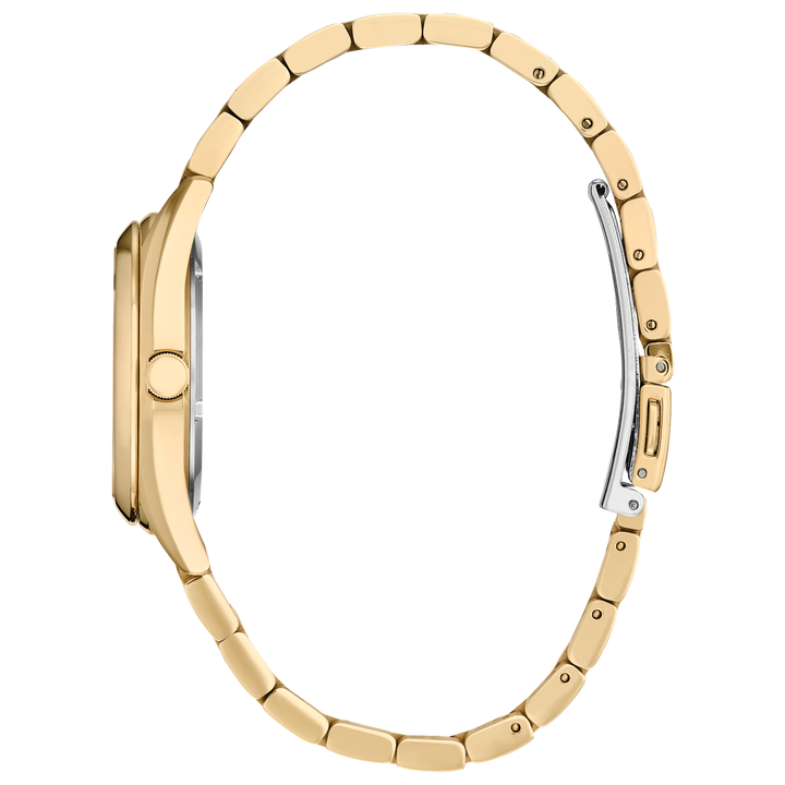 When sporty style meets luxury, you get this latest stunner from Citizen. Joining ready-for-anything wearability with feminine elegance, this time-and-date timepiece is the ultimate day-to-evening watch to wear. The gold-tone stainless steel case measures 33mm in diameter and is presented on a matching, 3-link stainless steel bracelet for a sleek, versatile wear on the wrist. The radiant white mother-of-pearl dial is characterized by its highly legible style and diamond accents, elevating the sporty wearer one step further. A water resistance up to 100 metres helps the dynamic watch maintain a host of functionality without compromising its alluring appearance. Powered by Citizen’s proprietary Eco-Drive technology to provide light-powered vitality continuously and sustainably without ever needing a battery. Calibre E013.