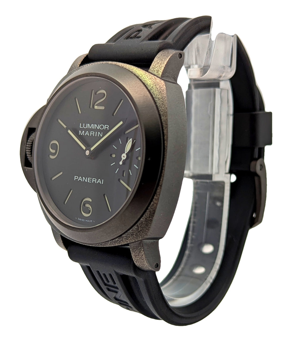 The Panerai Luminor Marina PAM00026, also known as the "Panerai Luminor Marina Destro," is a distinctive and highly sought-after timepiece in Panerai's collection. This model is particularly renowned for its "Destro" configuration, designed for left-handed wearers, with the crown guard positioned on the left side of the case. A robust 44mm cushion-shaped case made of matte, black stainless steel and PVD-coated finish, offers a stealthy, durable aesthetic.The signature "Marina" small seconds subdial is positioned at 3 o'clock. The PAM00026 epitomizes Panerai’s blend of Italian craftsmanship and Swiss watchmaking expertise, making it a timeless choice for aficionados and adventurers alike.