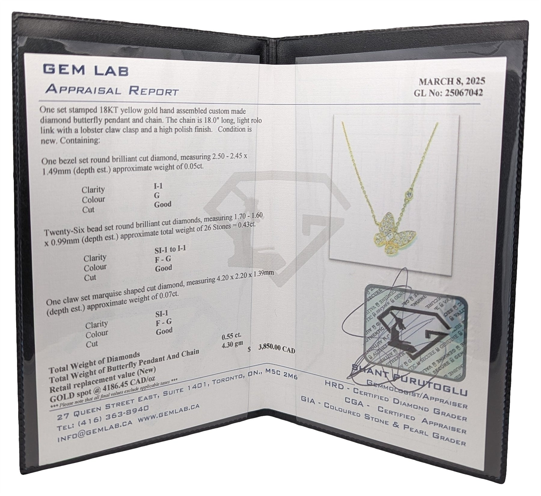 One set stamped 18KT yellow gold hand assembled custom made diamond butterfly pendant and chain. The chain is 18.0" long, light rolo link with a lobster claw clasp and a high polish finish. Condition is new. Containing: